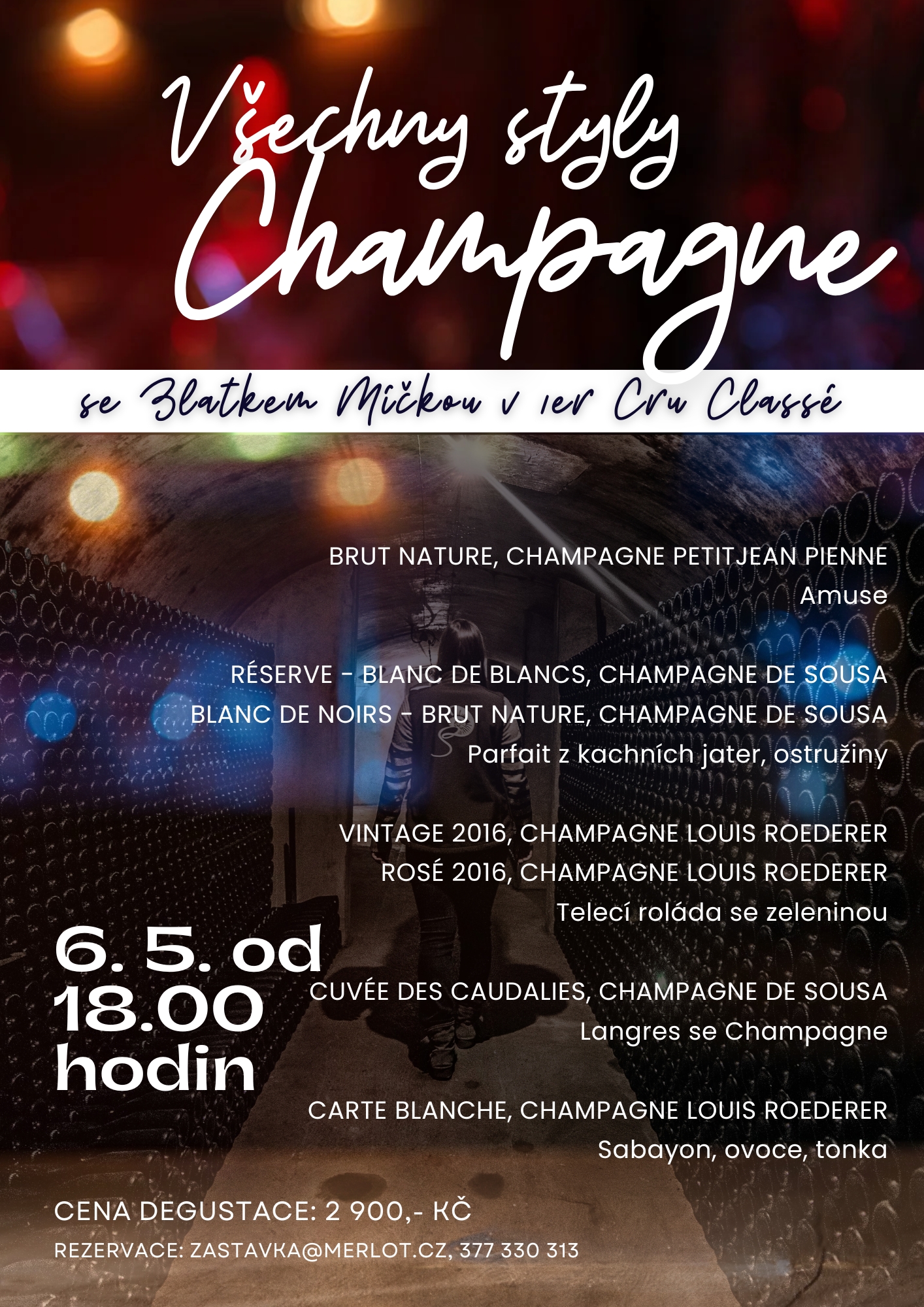 Zažijte jedinečný večer věnovaný jednomu z nejprestižnějších vinařských regionů světa – Champagne. Společně se sommelierem Zlatkem Mičkou vás provedeme fascinujícím světem šampaňského a ukážeme vám, jak rozmanité styly může tento ikonický nápoj nabídnout.